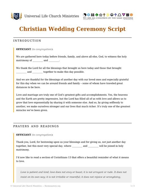 Please note that this sample wedding ceremony script uses male and female pronouns; There’s a romantic in all of us, and sometimes we just need to let it out. This traditional wedding ceremony script incorporates christian messaging to produce an officiant script that covers all elements one might expect when attending a traditional wedding.